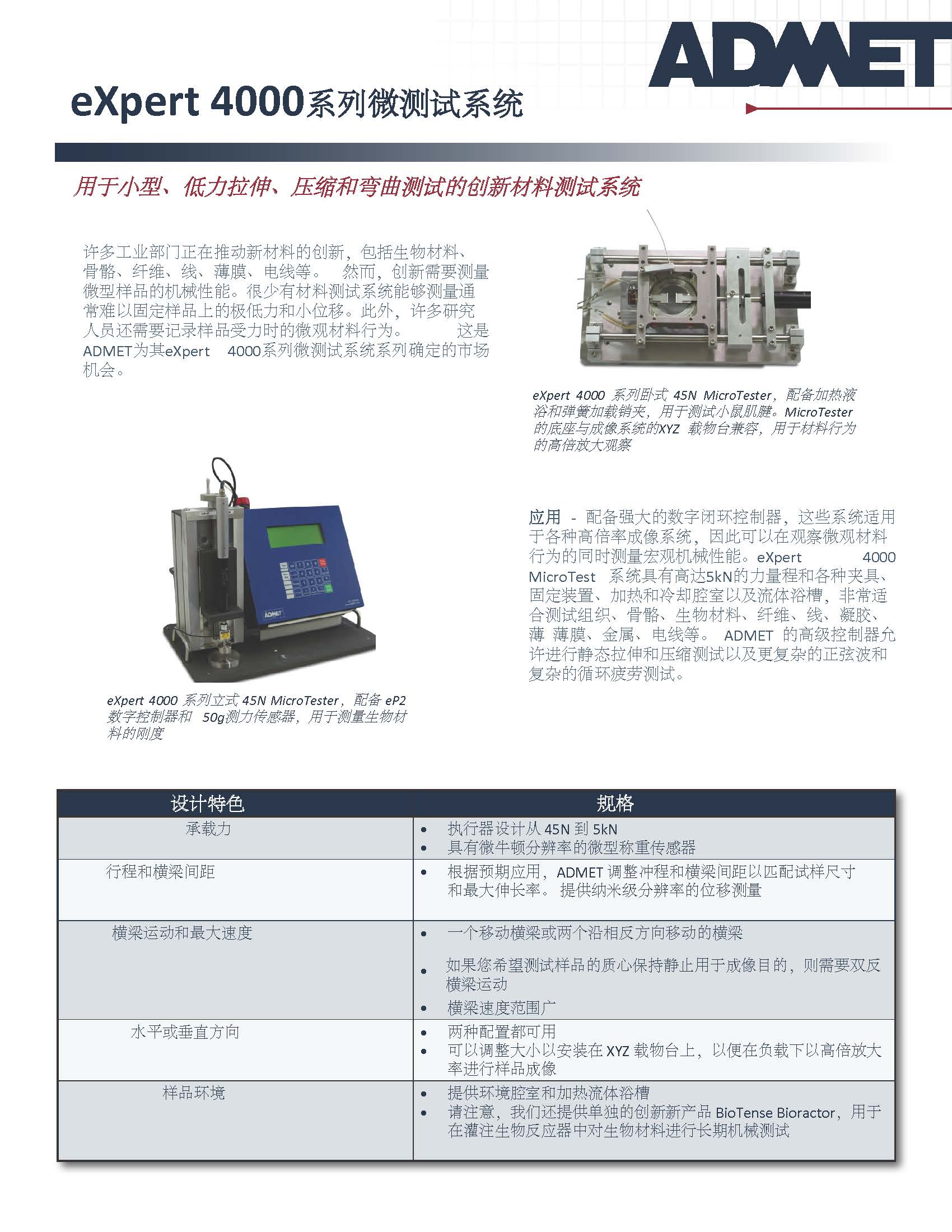 eXpert 4000系列微測試系統 概述 用于小型、低力拉伸、壓縮和彎曲測試的創新材料測試系統 許多工業部門正在推動新材料的創新,包括生物材料、骨骼、纖維、線、薄膜、電線等。 然而,創新需要測量微型樣品的機械性能。很少有材料測試系統能夠測量通常難以固定樣品上的低力和小位移。此外,許多研究人員還需要記錄樣品受力時的微觀材料行為。這是 ADMET為其eXpert 4000系列微測試系統系列確定的市場機會。 ? 特征: 手掌式微型設計 適用于顯微鏡載物臺 執行拉伸、壓縮和彎曲測試 量程高達 5kN; 能夠進行毫克級低力測試 速度高達 500 毫米/分鐘