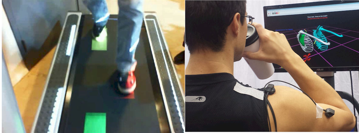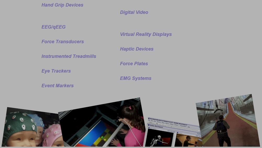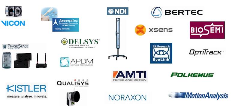 各種捕捉相機、位置跟蹤器、EMG(肌電圖)、測力臺、儀器式跑步機、儀器式樓梯、手傳感器、EEG腦電圖、定量腦電圖(quantitative EEG,qEEG)系統、數字視頻、事件標記和其他模擬設備、虛擬現實和觸覺設備等等。