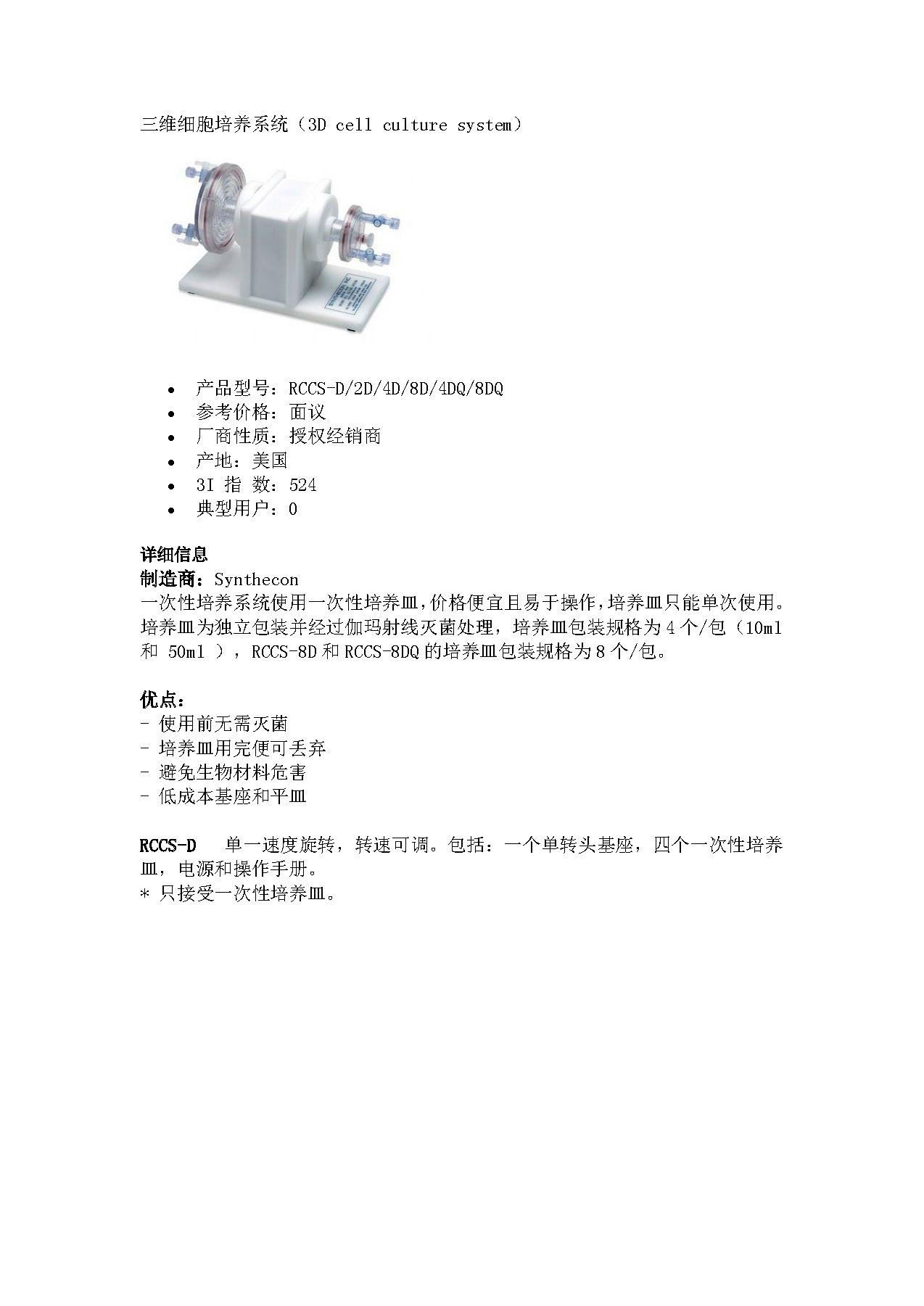 美國Synthecon RCCS-RCMW旋轉微重力三維細胞培養系統已經成為應用微載體技術進行細胞大規模擴增的一種較常用細胞培養系統。該系統是基于美國航空航天局為模擬空間微重力效應而設計的一種三維細胞培養系統。該Synthecon RCCS-RCMW旋轉微重力三維細胞培養系統既可以用于微載體大規模細胞培養,又能在其內培育細胞與支架形成的三維空間復合體。至今,近百種組織細胞均在該系統內成功進行了大規模擴增。