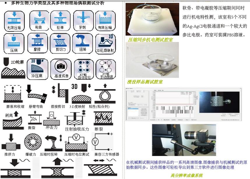 該系統(tǒng)是能模塊化集成壓縮、張力、剪切、摩擦、扭轉(zhuǎn)和2D/3D壓痕、3D輪廓及多力混合耦連測(cè)試的一體化微觀力學(xué)測(cè)試裝置。能對(duì)生物組織、聚合物、凝膠、生物材料、膠囊、粘合劑和食品進(jìn)行精密可靠的機(jī)械刺激和表征。允許表征的機(jī)械性能包括剛度、強(qiáng)度、模量、粘彈性、塑性、硬度、附著力、腫脹和松弛位移控制運(yùn)動(dòng)。