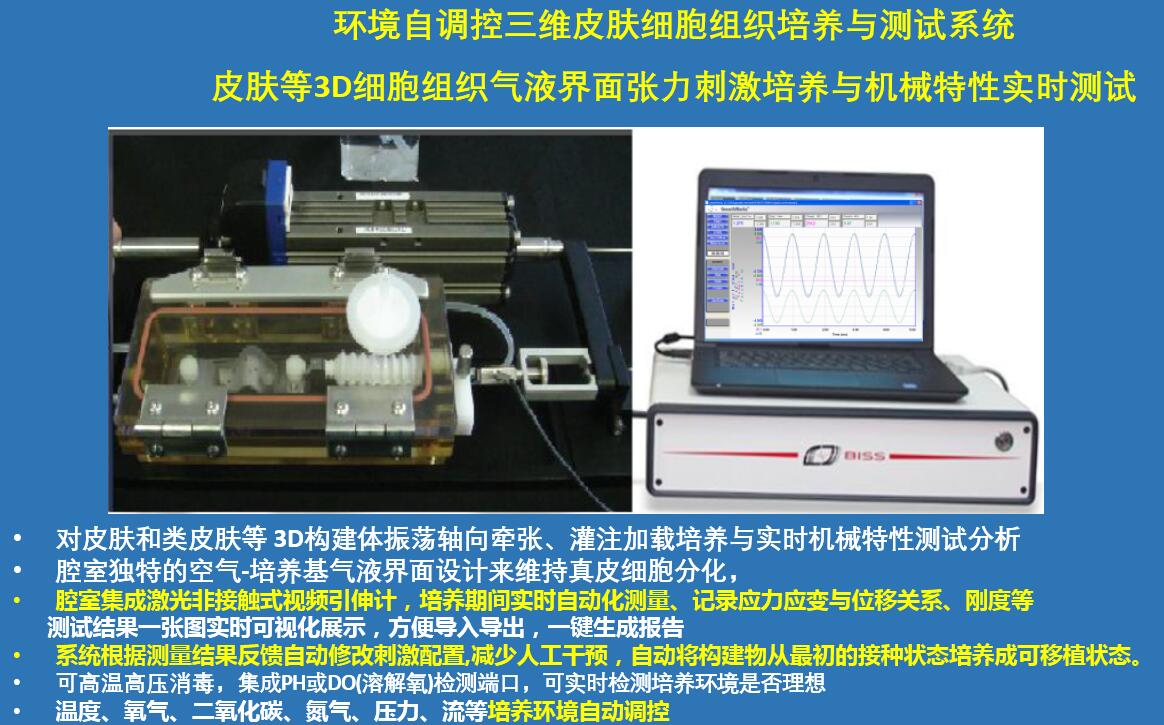 提供可以用于包括三維軟骨、血管、肌腱韌帶、皮膚、心臟瓣膜、骨組織在內的等各種3D細胞組織材料構建體機械力加載培養與機械特性實時測量,可偶聯電刺激的各種三維構建體應力刺激培養與機械特性實時測試分析系統。