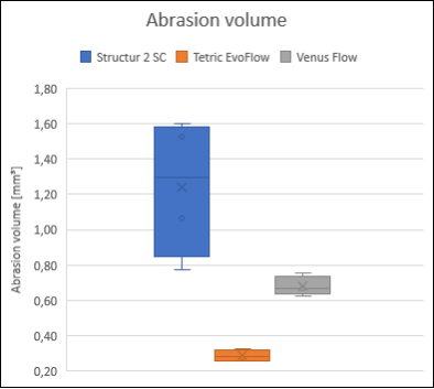 在Voco Structur 2 SC扁平試樣上,使用四個不銹鋼圓錐體和四個硬質合金圓錐體作為拮抗劑。在蒸餾水中,以50N進行240,000個在咀嚼模擬循環后(相當于體外約1年),測量硬度,磨損量以及大深度。