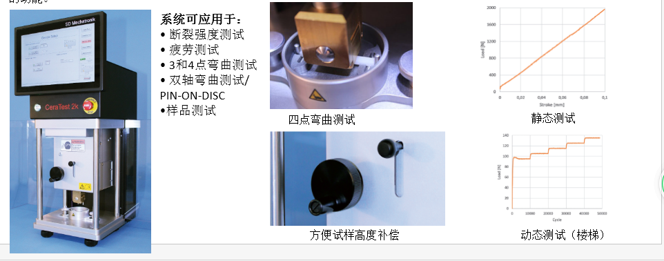 由SD Mechatronik推出的新一代CeraTest 2k可在單個設備中對氧化鋯、陶瓷材料和植入物進行靜態和動態測試,集靜態斷裂載荷測試和在動態操作模式下擺動測試兩大關鍵功能于一身,為用戶提供快速,可重復且自主的解決方案。靜態測試中大載荷可達2kN。動態測試中用戶可自定義正弦力曲線的大和小限值。 載荷頻率范圍為1Hz至15Hz。其應用軟件已包括長時和階梯測試的功能。