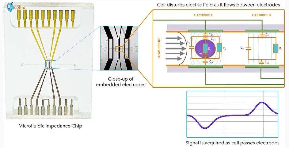 阻抗譜是一種通過在嵌入微流體芯片的兩個電ji之間施加電場來測量細胞或粒子的電阻和電容特性的方法。當每個細胞流過電ji時,電場受到干擾。
