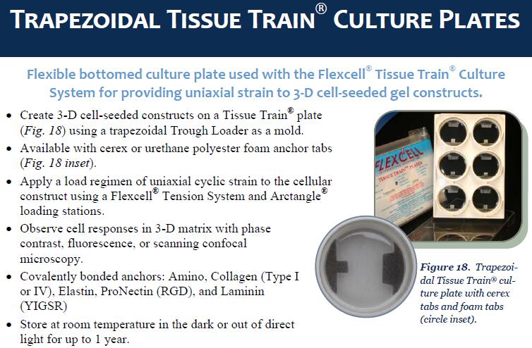flexercell Tissue Train® 3D Culture System is a computer-regulated cell stretching bioreactor system that allows users to create 3-dimensional cell-seeded gels and apply uniaxial or equibiaxial tensile strains to these gels. The Tissue Train® 3D Culture System is a uniaxial system that allows researchers to apply user-defined strain regimens to simulate heart rate, walking, running, and other dynamic exercise patterns to tissue constructs. This will enable you to build bioartificial tissue samples of skin, tendon, ligament, etc. up to 35 mm in length.