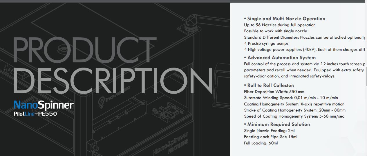 PE-550是我們zui暢銷的用于連續生產納米纖維的靜電紡絲設備,適用于工業規模的納米纖維生產。它的主要優勢是可擴展性,因為它適用于生產線以及R&D項目。PE-550配有56個噴嘴,可實現大規模生產納米纖維的高生產率,但在R&D項目中,它也可配有1個噴嘴。