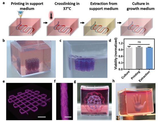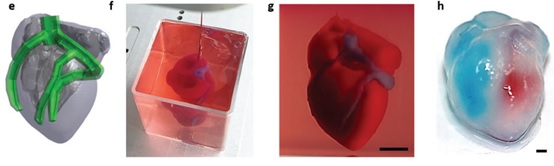 文章介紹了,3D打印構(gòu)建特異化可灌注的厚心臟補(bǔ)片及心臟器官。采用來自患者的網(wǎng)膜組織中細(xì)胞,重編輯為多能干細(xì)胞,分化為心肌細(xì)胞和內(nèi)皮細(xì)胞,脫細(xì)胞基質(zhì)作為打印生物墨水。用兩種細(xì)胞及生物墨水,實(shí)現(xiàn)血管化心臟結(jié)構(gòu)。(使用設(shè)備 regenHU 3DDiscovery)![]() 圖1 研究過程示意圖。從患者身上提取網(wǎng)膜組織,當(dāng)細(xì)胞與基質(zhì)分離時(shí),基質(zhì)被加工特異化的熱敏水凝膠。這些細(xì)胞被重新編程為多能干細(xì)胞,然后分化成心肌細(xì)胞和內(nèi)皮細(xì)胞,從而包裹在水凝膠中,生成用于打印的生物墨水。然后打印生物墨水,以制造具有血管結(jié)構(gòu)的貼片和復(fù)雜的細(xì)胞化結(jié)構(gòu)。由此產(chǎn)生的自體工程組織可以移植回患者體內(nèi)修復(fù)或更換受損/病變器官,且排斥風(fēng)險(xiǎn)較低。 ![]() 圖2 特異化3D打印心臟貼劑:a為心臟補(bǔ)片的3D模型;b為獨(dú)特的生物墨水及打印過程的側(cè)視圖;c為打印具有血管結(jié)構(gòu)的心臟補(bǔ)片 ![]() 圖3 在支撐介質(zhì)中打印特異化水凝膠:a為3D打印機(jī)理圖,該結(jié)構(gòu)體在支撐中自由打印,然后在37℃下交聯(lián)特異化水凝膠,通過酶促或化學(xué)降解支撐材料,該結(jié)構(gòu)體安全轉(zhuǎn)移到培養(yǎng)基中培養(yǎng);b為在支撐槽中打印多層交聯(lián)結(jié)構(gòu);c為從支撐槽中提取出的結(jié)構(gòu)體;d為打印前、打印后及提取后的細(xì)胞活力;e為打印在支撐介質(zhì)中雙層結(jié)構(gòu)的3D共聚焦圖像;f為打印生物墨水單根線條;g,h為精準(zhǔn)打印特異化水凝膠的厚結(jié)構(gòu)體。尺寸:(b) = 0.5 cm, (e) = 1 mm, (f) = 100 ?m, (g,h) = 1 cm. ![]() 圖4 打印具有血管結(jié)構(gòu)的厚組織,小型、細(xì)胞化的人類心臟:e為人體心臟CAD模型;f,g為在支撐介質(zhì)中打印的心臟;h從支撐池中取出后,分別從左右心室注射紅色和藍(lán)色染料,以顯示空腔和中間間隔。 Noor N, Shapira A, Edri R, et al. 3D Printing of Personalized Thick and Perfusable Cardiac Patches and Hearts[J]. Advanced Science, 2019.(IF=12.441)
