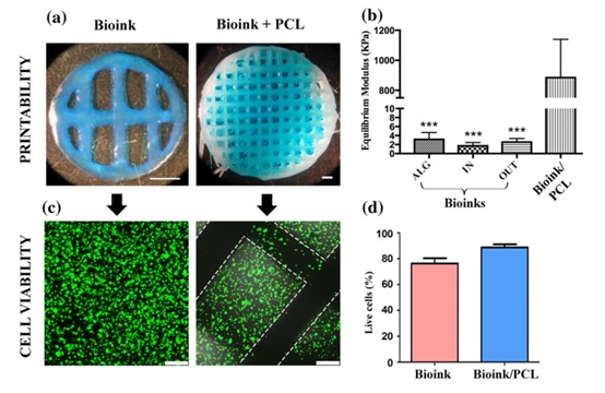 每年數百萬半月板手術案例,切除半月板后患者難以恢復正常。脂肪干細胞具有良好的軟骨成型能力,來自半月板的ECM(細胞外基質)可以更好支持細胞生長及組織分化。通過ECM和海藻酸水凝膠構成的生物墨水,加上聚已內酯(PCL)共同打印,制造出具有一定機械強度的可植入支架。 ![]() 圖1 半月板細胞外基質(ECM)的分離,將豬半月板分離,根據稠度和外觀分為外區和內區,將其消化胃蛋白酶后,進行冷凍干燥 ![]() 圖2 三維生物打印聚己內酯(PCL)增強的細胞外基質功能化水凝膠支架:a左為打印細胞外基質-海藻酸生物墨水支架、a右為打印PCL增強生物墨水支架(標尺為1 mm);b為所有打印水凝膠與PCL增強結構的平均模量;c左為打印細胞外基質-海藻酸生物墨水支架細胞活性、c右為打印PCL增強生物墨水支架細胞活性;d為細胞活性的定量分析。(PCL與ECM功能化生物墨水共打印,不會對細胞活性有負面影響,并且增強機械性能) Romanazzo S , Vedicherla S et al. Meniscus ECM‐functionalised hydrogels containing infrapatellar fat pad‐derived stem cells for bioprinting of regionally defined meniscal tissue[J]. Journal of Tissue Engineering & Regenerative Medicine, 2017.