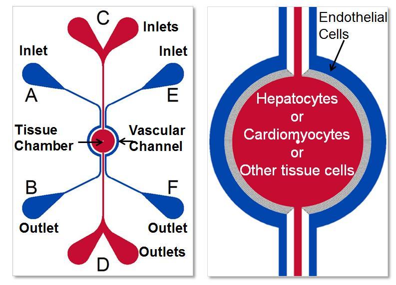 Current in vitro models routinely utilize 2D monolayers or 3D aggregates of cells under static conditions for studying drug toxicity. These models fail to reproduce in vivo physiological features such as morphological size, physiological blood flow and cellular (biological) make-up of the specific organs being investigated. Other microfluidic models employ a membrane-based top-bottom two-compartment architecture, inherently limiting key desired features such as real-time visualization and the ability to simultaneous analyze multi-cellular cultures.
